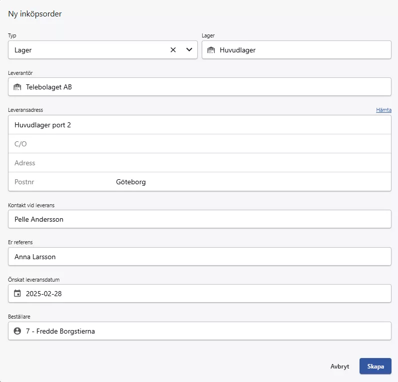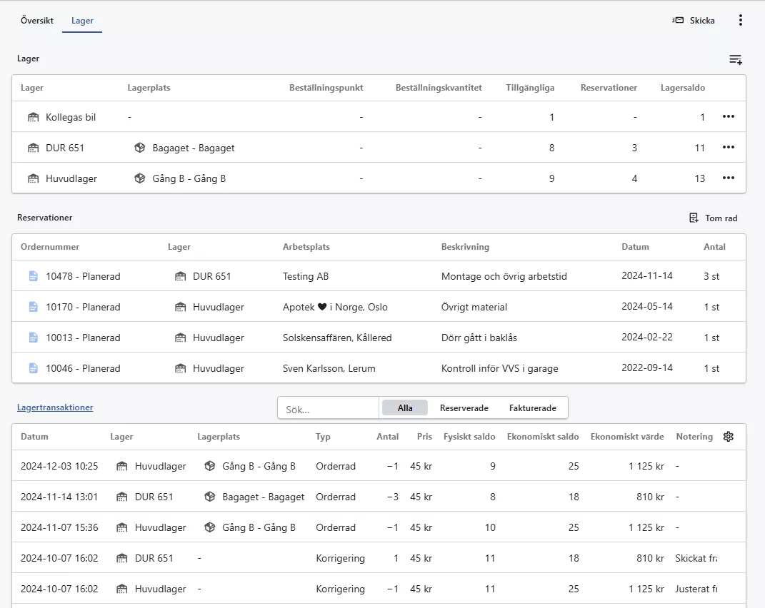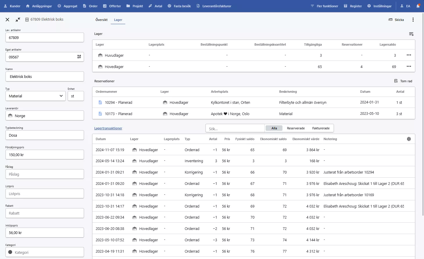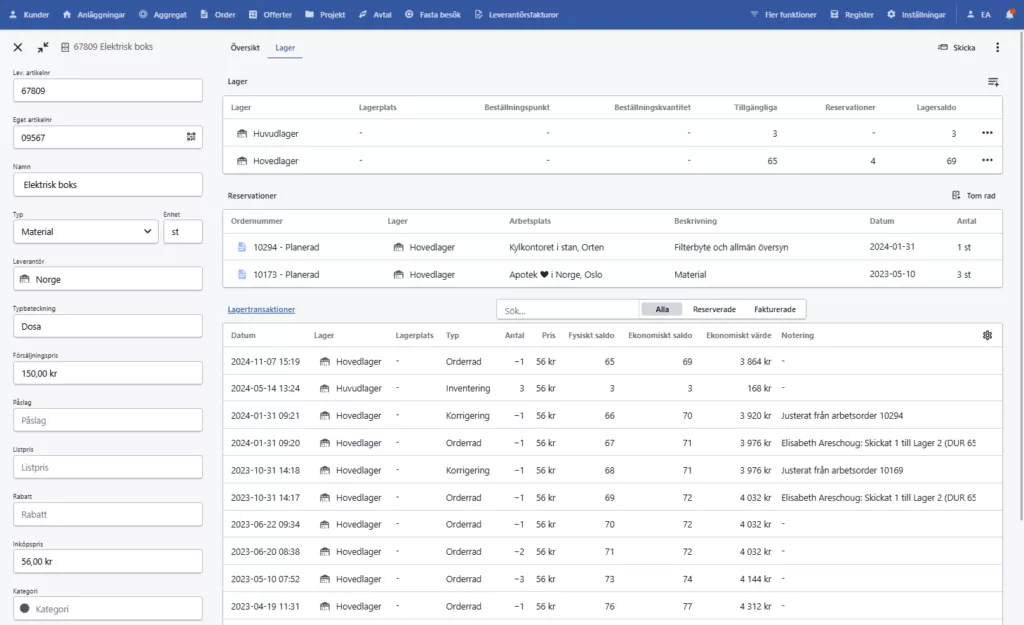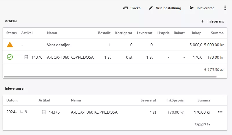 Inköp hanteras smidigt direkt i lagermodulen. Skapa inköpsorder från ett projekt, en order eller direkt från lagret. Systemet markerar automatiskt de artiklar som behöver fyllas på, till exempel de som nått sin beställningspunkt, och föreslår rätt kvantitet enligt dina inställningar.